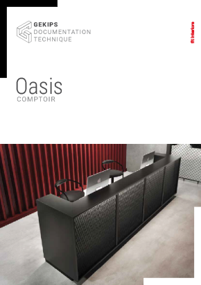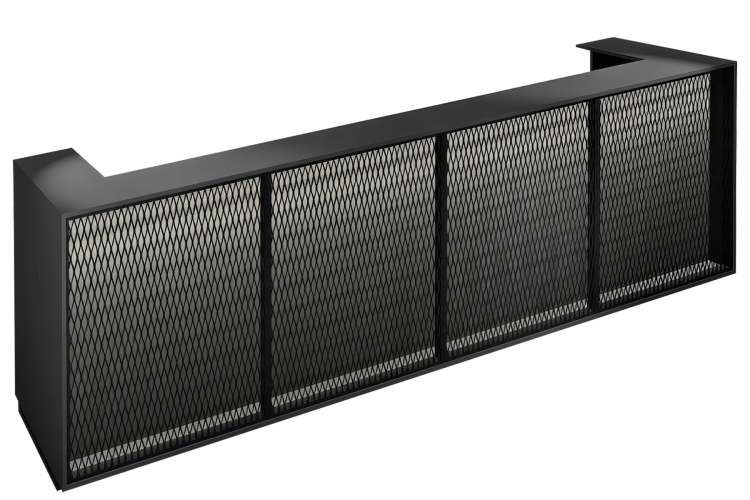 Comptoir modulaire avec treillis déployé peint en noir mat, structure en panneau mélaminé noir mat (MFC) de 18 mm d’épaisseur.
