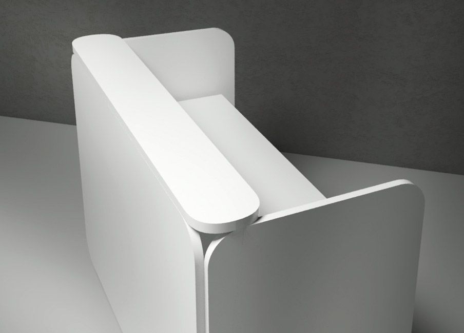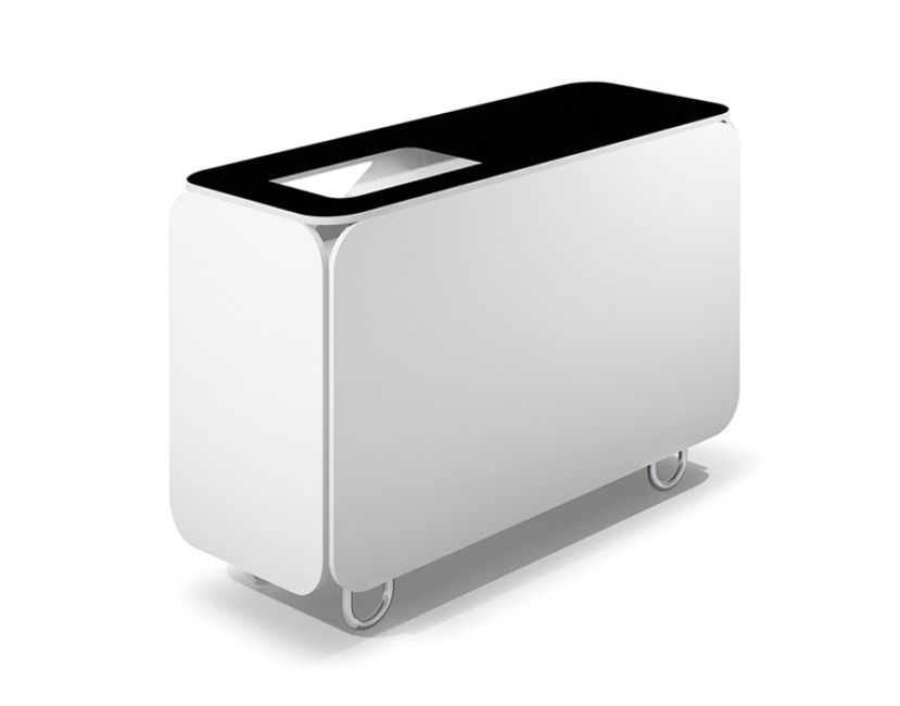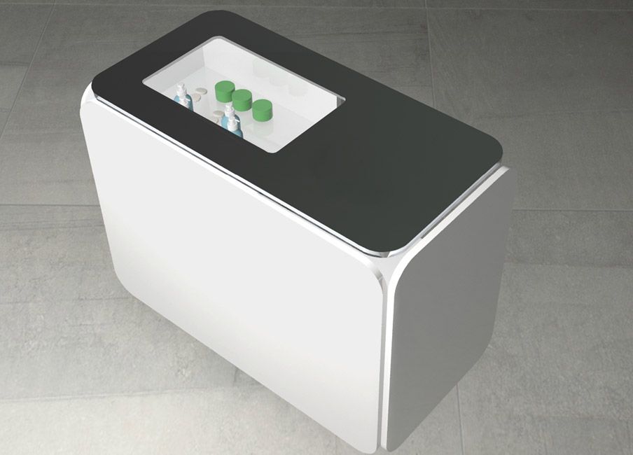 Structure en panneau mélaminé avec éléments arrondis de 18 mm d’épaisseur avec dessus ou avec vitrine d’exposition éclairée par LED à lumière naturelle 4000 k°.